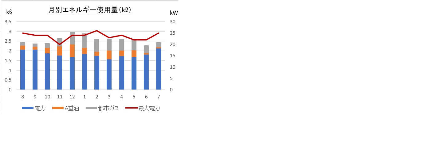 使用エネルギーは高圧電力、重油。蒲鉾、さつま揚げ、伊達巻等の練り物加工を行っているため、すり身加工機、揚げ物機等生産設備を使用。ユーティリティとしてはコンプレッサー、冷凍庫4台、冷蔵庫2台(大型冷凍庫は別の場所にて使用しているのでいずれも家庭用)蛍光灯40本程、空調機は補助金使用して更新済み(5年ほど前)