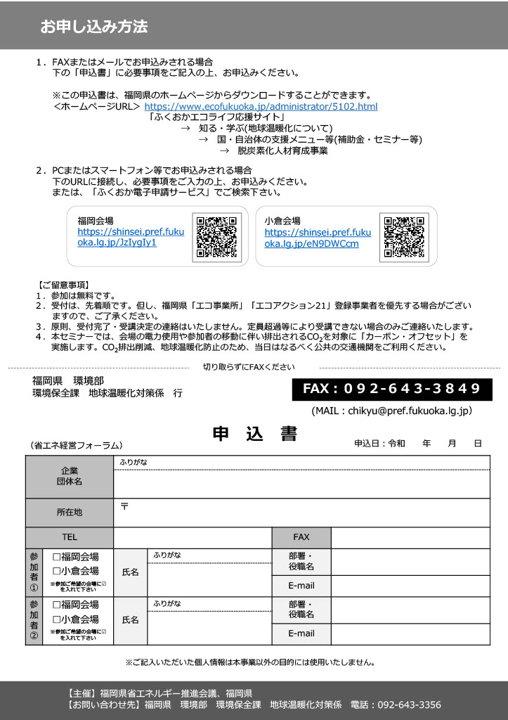 または、ふくおかエコライフ応援サイトに掲載の申込用紙をFAX又は電子メールで送付してください。